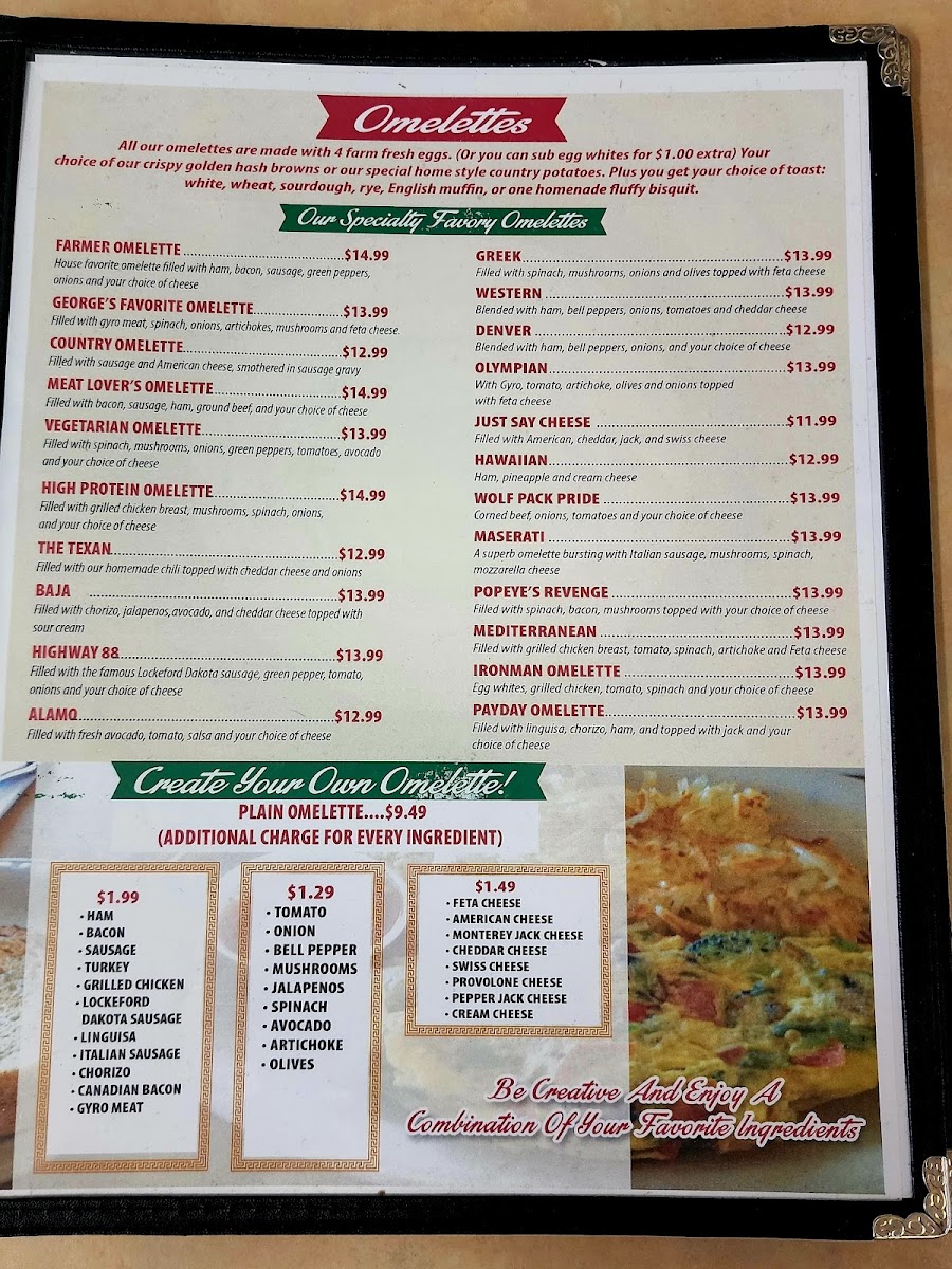 - Breakfast: Expect generous portions, like the enormous Omelets made from four eggs and served alongside fluffy biscuits with whipped butter.